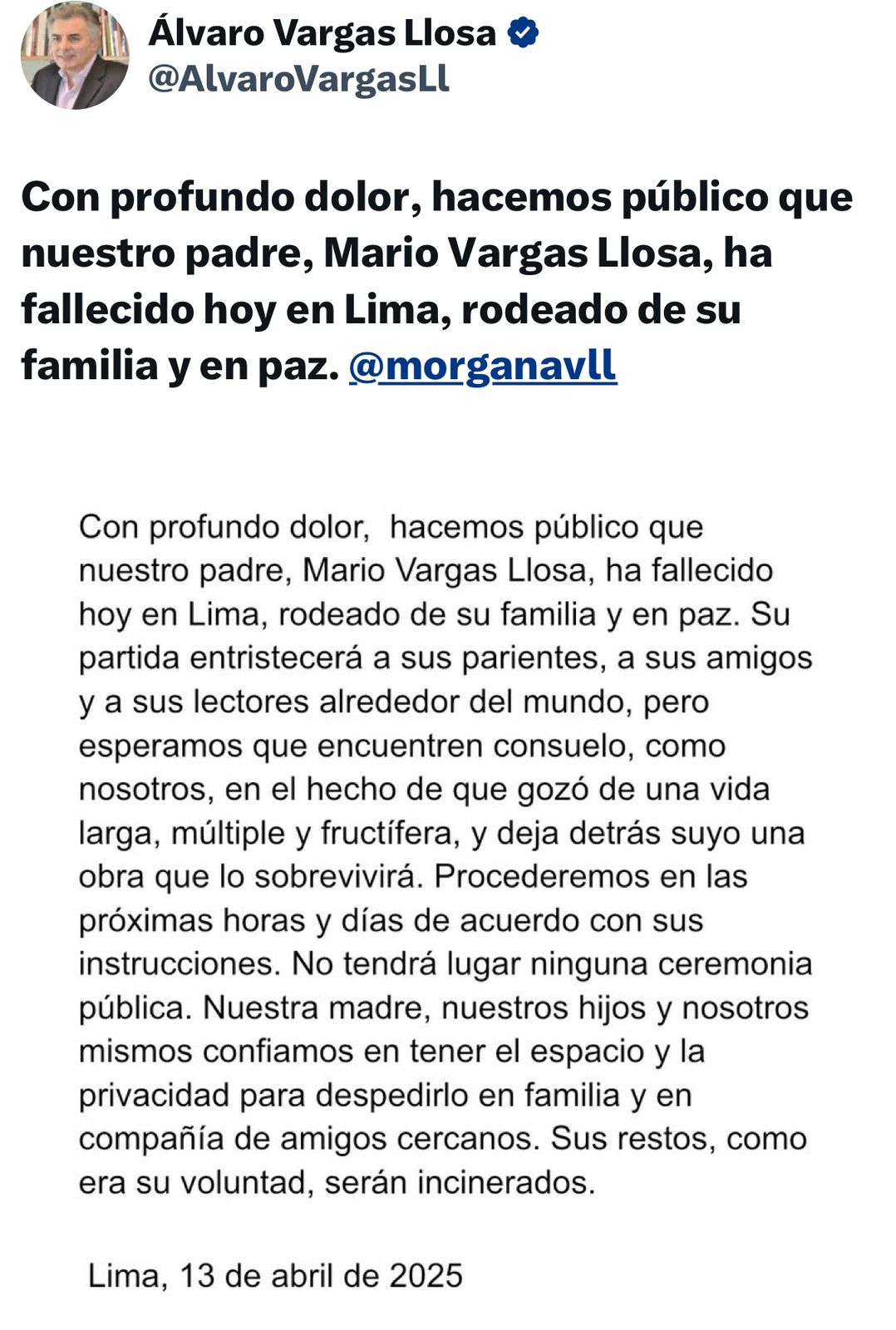 “Con profundo dolor hacemos público que nuestro padre, Mario Vargas Llosa, ha fallecido hoy en Lima rodeado de sus familias y en paz”, inicia el escrito en X de Álvaro Vargas Llosa.